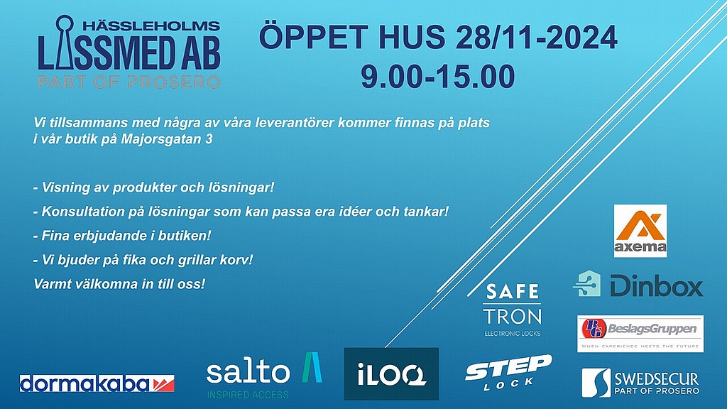 Besök Hässleholms Låssmed torsdagen 28 november för fina erbjudanden, visning av produkter och fika.