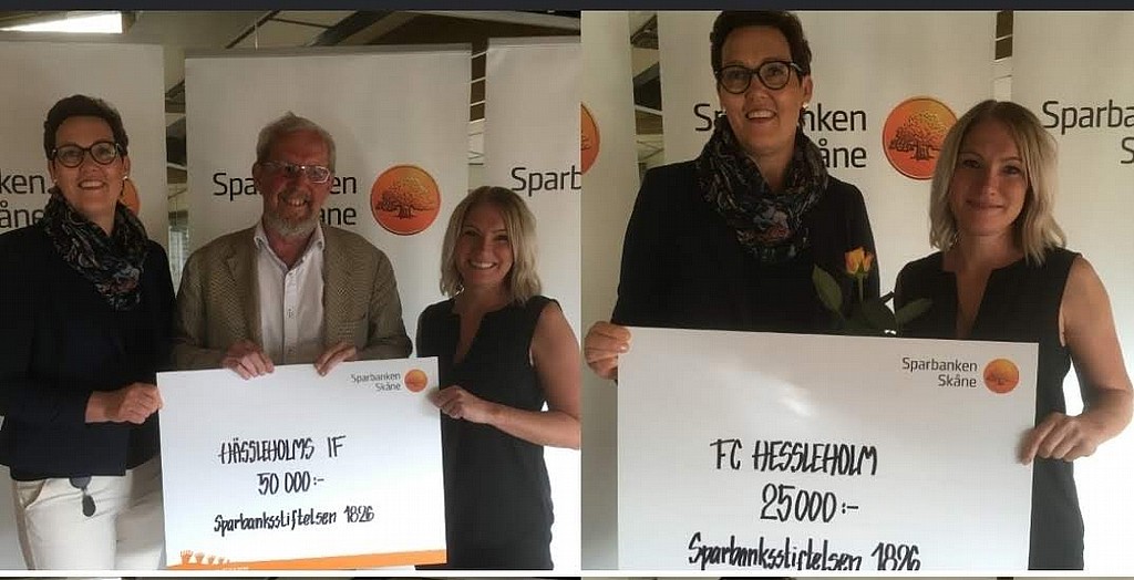 På den andra bilden tas bidrag från Sparbanksstiftelsen emot för finansiering av projektet Mötesplats Ljungdala, som ska gå till att integrera invandrarflickor i fotbollslivet och därmed möjligheten att få ingå i en gemenskap.